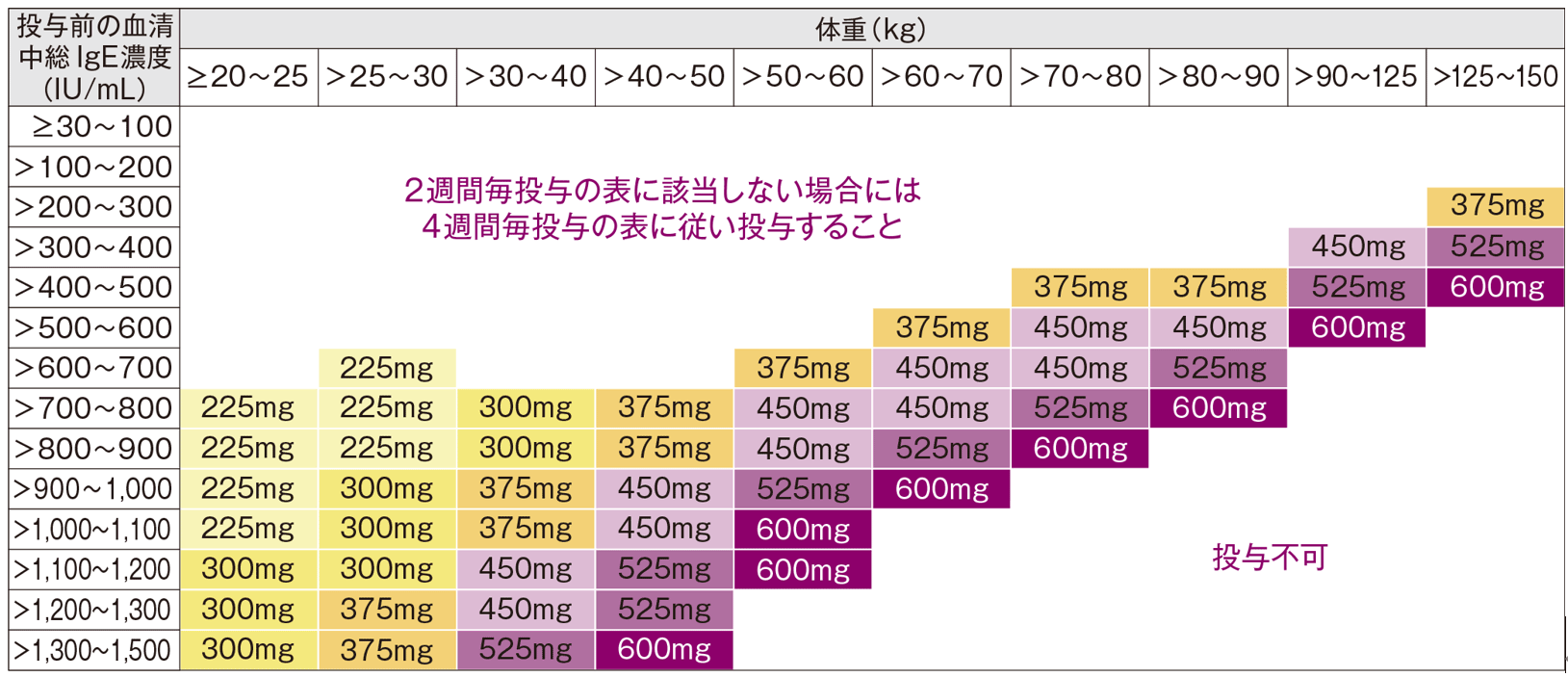 1回あたりの投与量や投与間隔は、血液検査(血清総IgE濃度)と体重によって決まります。そのため、費用は人によって異なります。