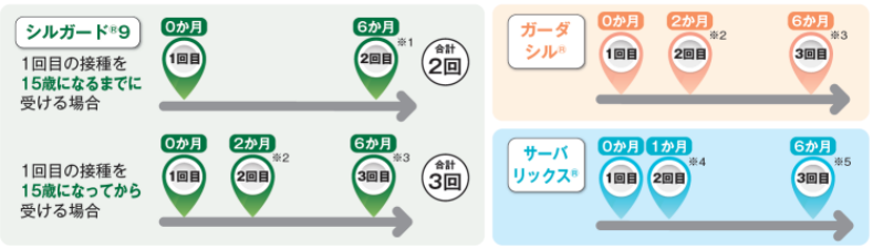 公費で接種できるHPVワクチンは3種類(サーバリックス、ガーダシル、シルガード9)あります。決められた間隔をあけて、合計3回接種します。