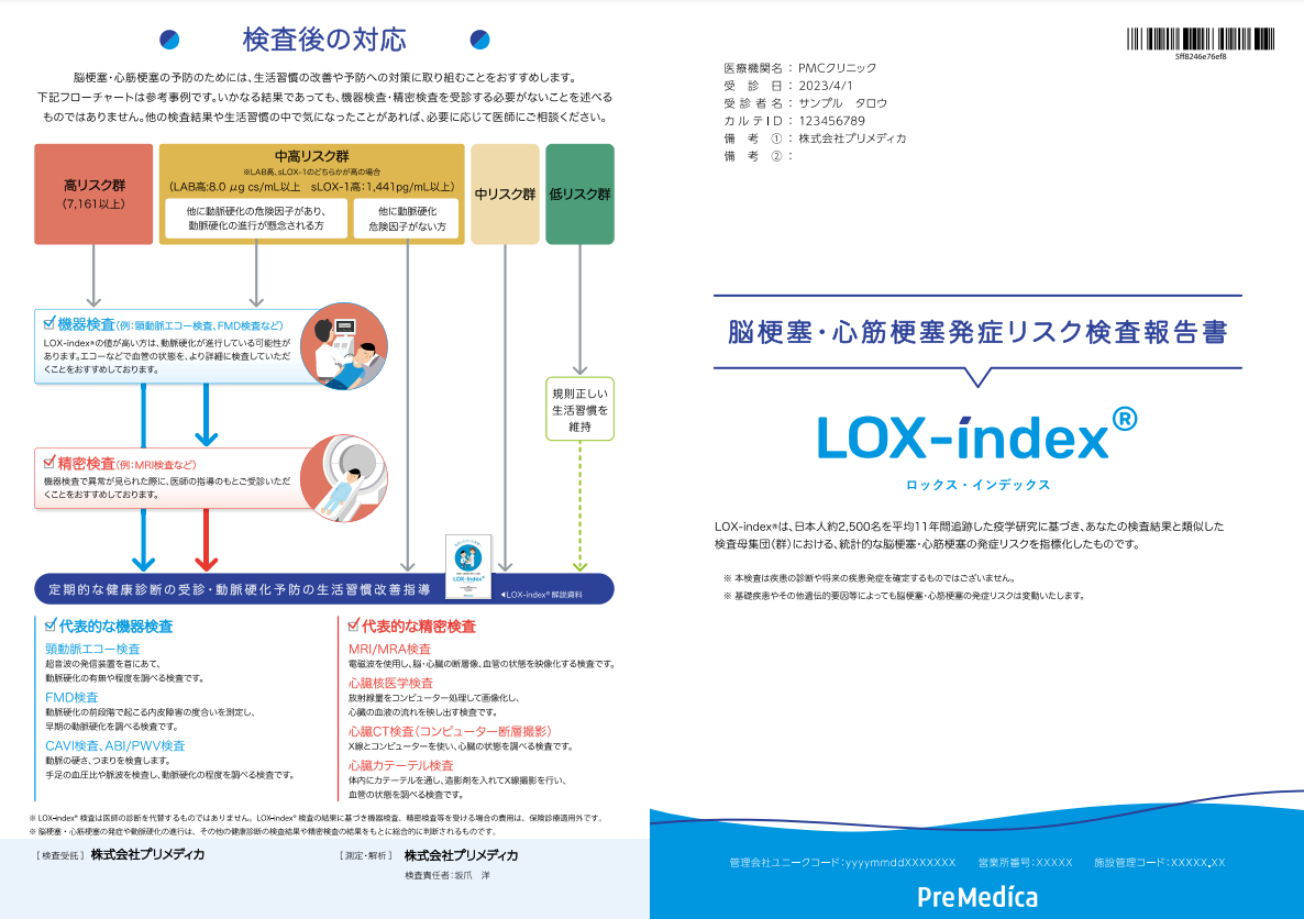 LOX-index®では血管の中に脂質が入っていくメカニズムに着目し、超悪玉化したコレステロールと、それと結合をして動脈硬化を進行させるLOX-1というタンパク質の2項目を測定します。動脈硬化の直接の原因物質を調べていますので、実際に血管に異常が出始める前の段階からリスクを調べることができます。そのため、動脈硬化の予防に特化した検査ともいえます。 ※関節リウマチ、妊娠中、出産後(3ヶ月以内)、発熱、痛風、腎不全のある場合に検査数値が高く出る可能性があります。