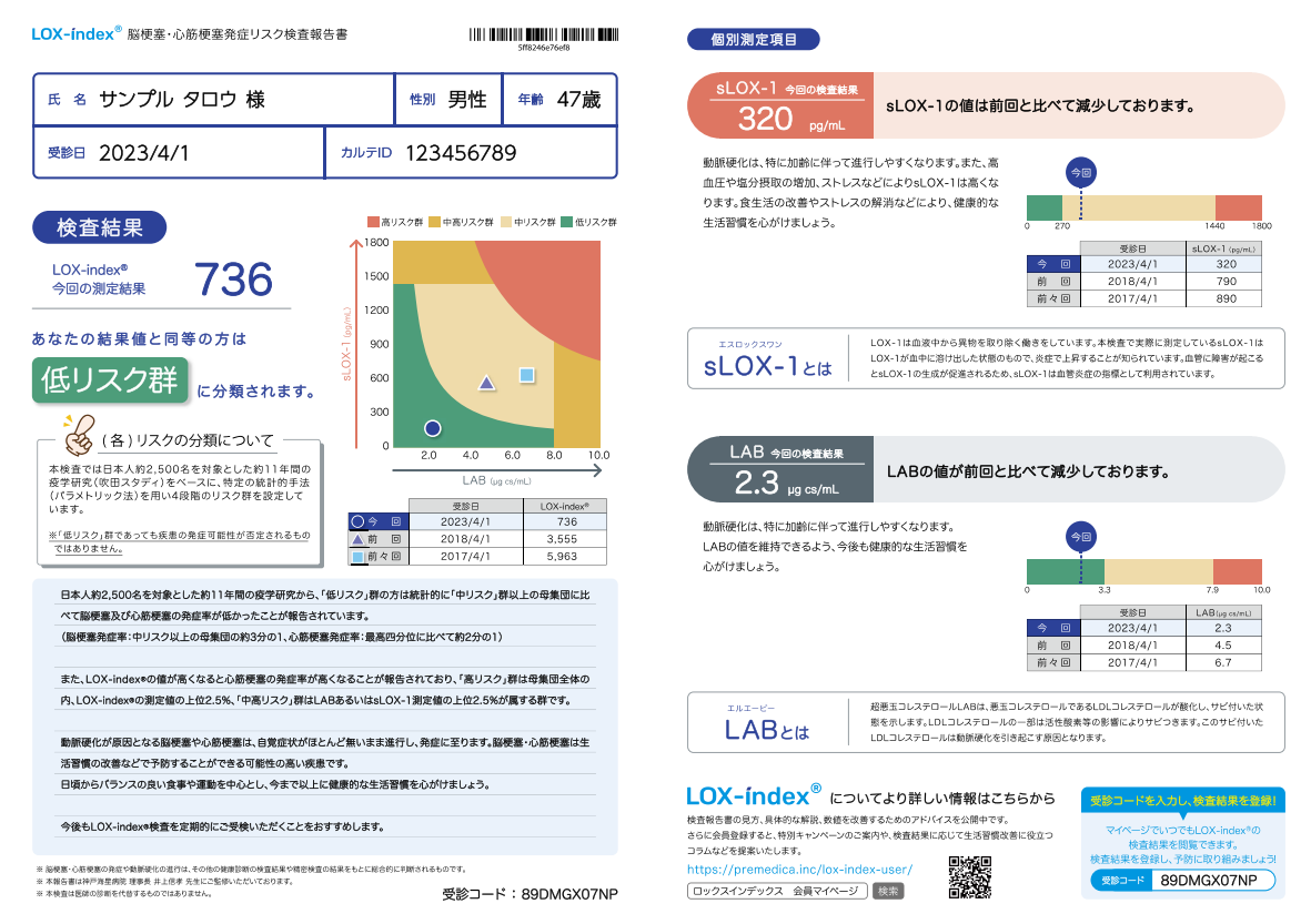 LOX-index®は、国立循環器病研究センター主導で約2,500名を対象として約11年追跡した研究成果をベースに開発されました。研究の結果、LOX-index®の値が高かった方は低かった方と比較して、脳梗塞の発症率が2倍、心筋梗塞の発症率が3倍であったという報告がされています。
